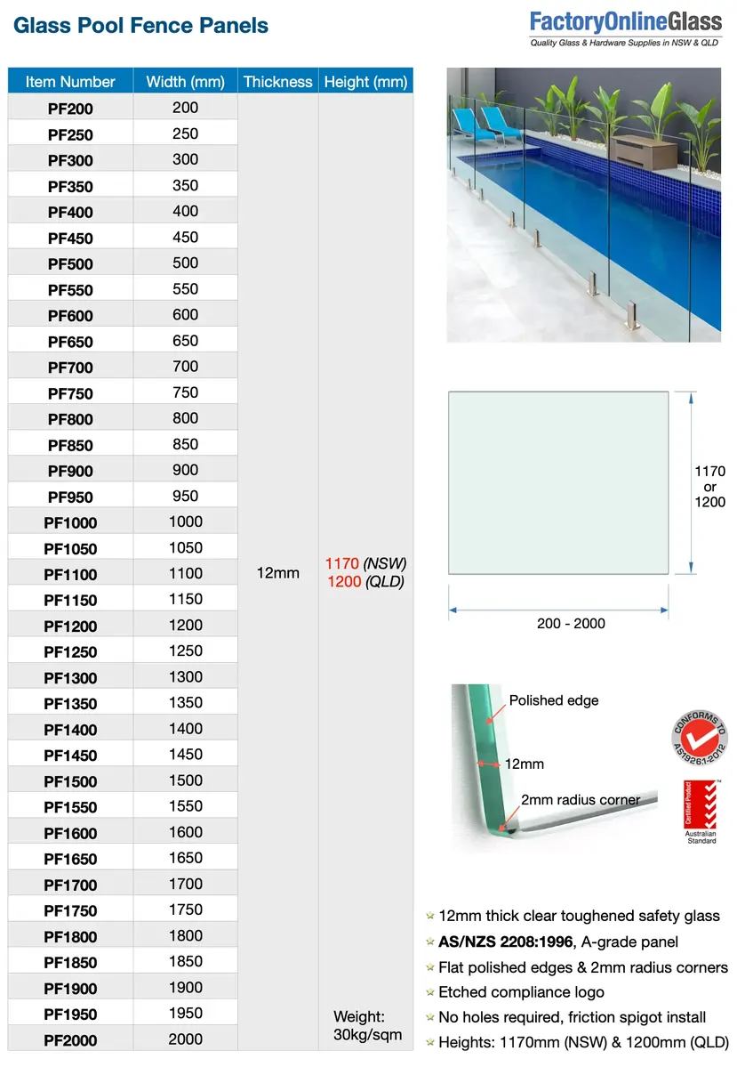 - Material: 12 mm clear toughened glass pool fence panel, no holes