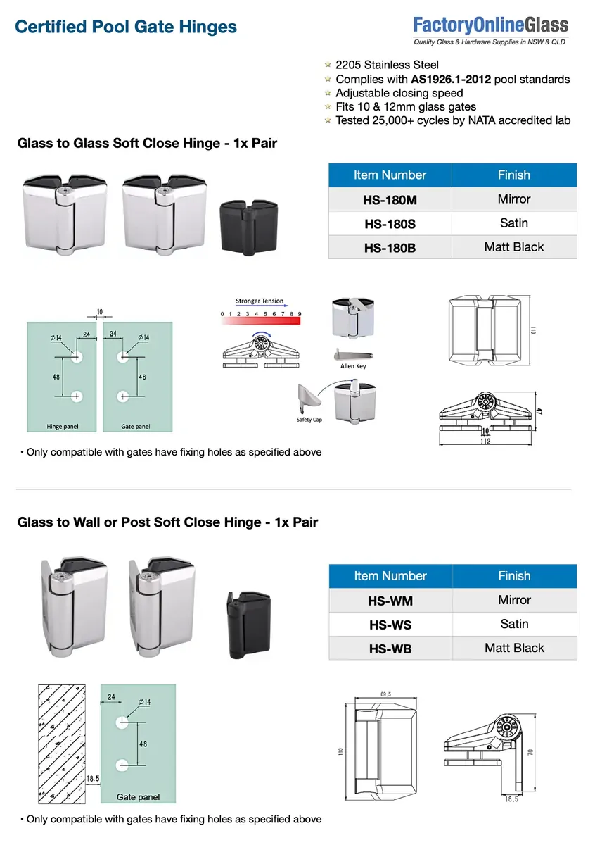 Ensure maximum safety and a premium feel with our heavy-duty Orion Soft-Close Pool Gate Hinges. Engineered with an adjustable closing speed to prevent gate slamming and fully compliant with Australian pool safety standards.